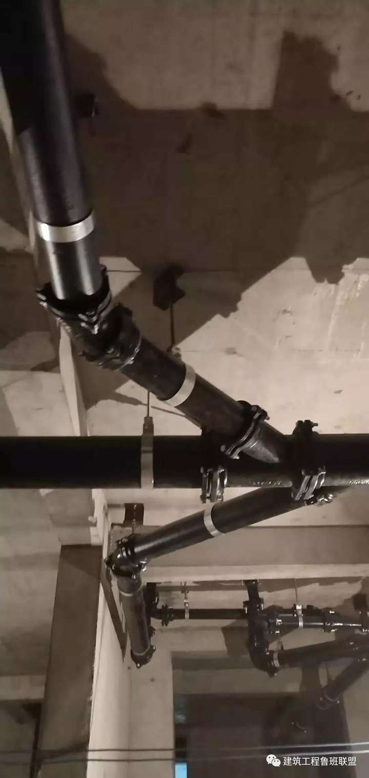 污水、废水管道纵向成线,横向有坡,管件顺水,支架合理,净高分析满足要求;污、废水干管在空间尺寸允许的情况下尽量采用斜45度三通为宜,能够保证后期排水干管畅通无堵;由于排水受室外出户标高控制,建议尽量贴梁、板下敷设。