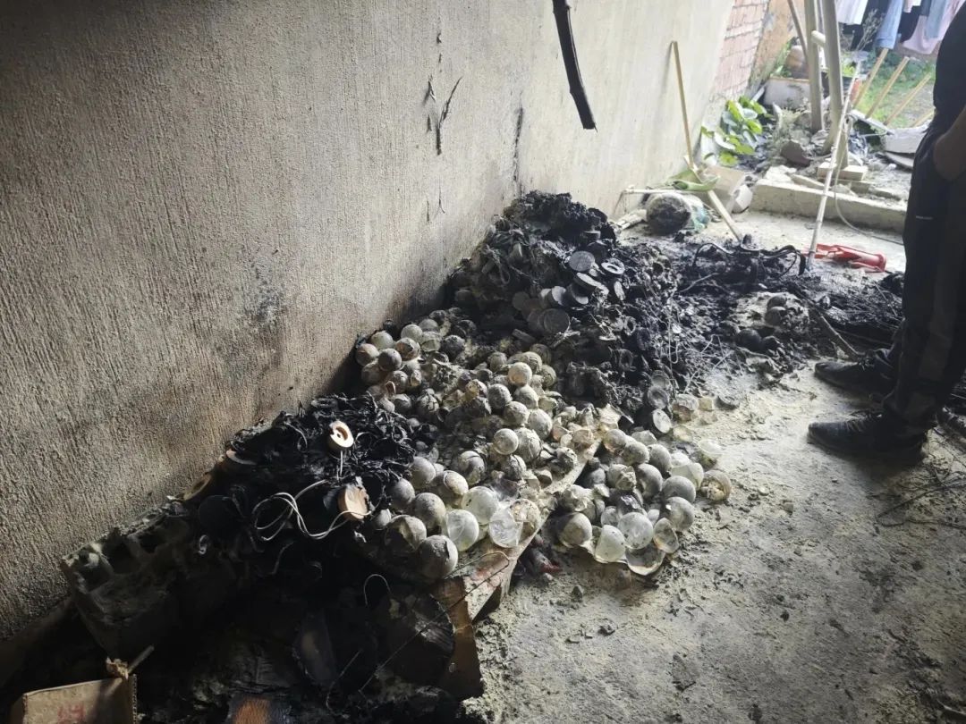 2024年5月,浙江金华,堆放在后院简易棚下的约80个水晶球,在阳光的照射下光能汇聚,热量聚集,引燃了纸板箱,火焰将庭院简易棚棚顶烧穿。