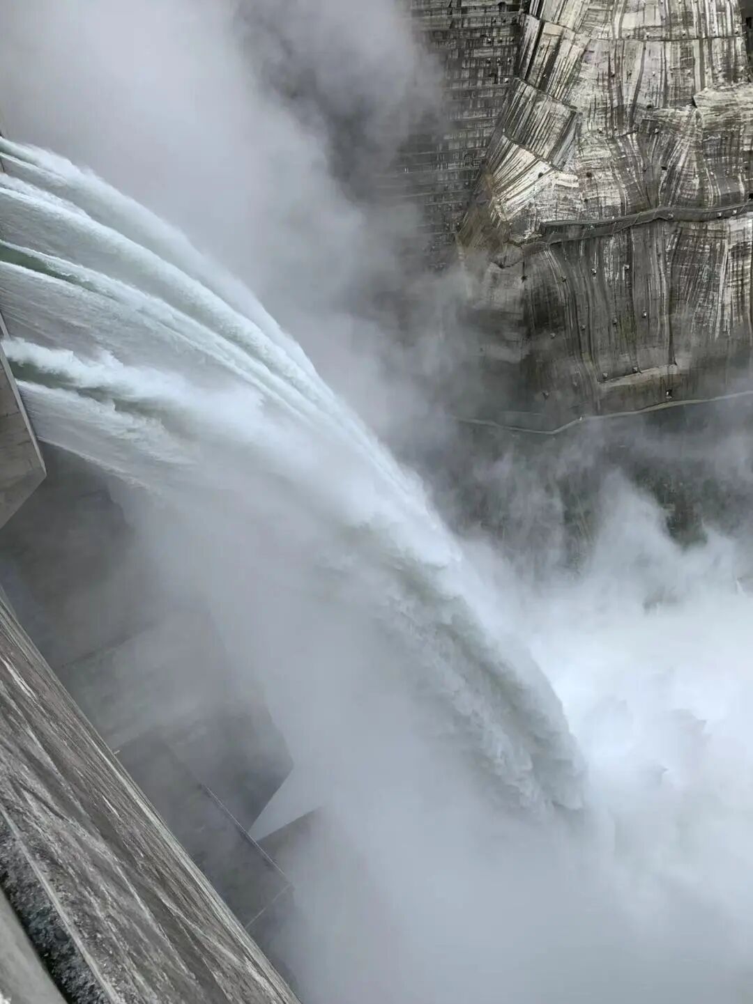 如果有幸遇到泄洪的场景,相信亲身的感受要比在电视中看到的更壮观、更直接。只见几条银色的巨龙喷薄而出,从几百米的高度直泻而下,在飞落中奔腾、翻滚、跳跃!然后猛然撞击在缓冲带上,水花在轰然巨响中再度腾起,化为一片白茫茫的水雾。